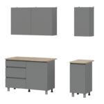 Напольные модули представляют собой комбинированный стол шириной 1000 мм одна половина которого отсек для хранения с ящиком и полкой шириной 400мм, вторая половина предназначена для установки мойки шириной 600 мм и стол со стационарной полкой шириной 1000 мм. На крайней левой и крайней правой створках нижних модулей нанесена фрезеровка.